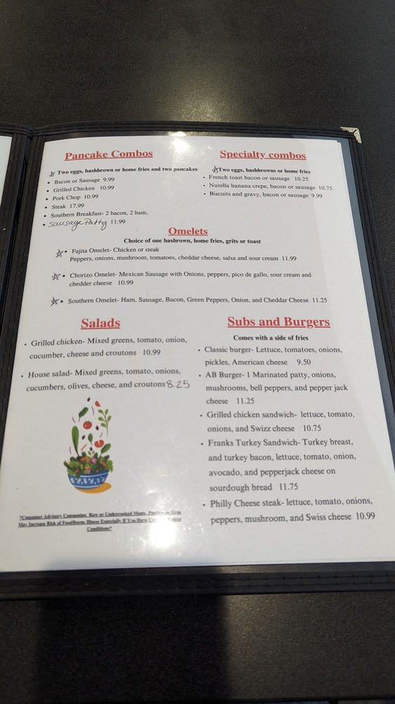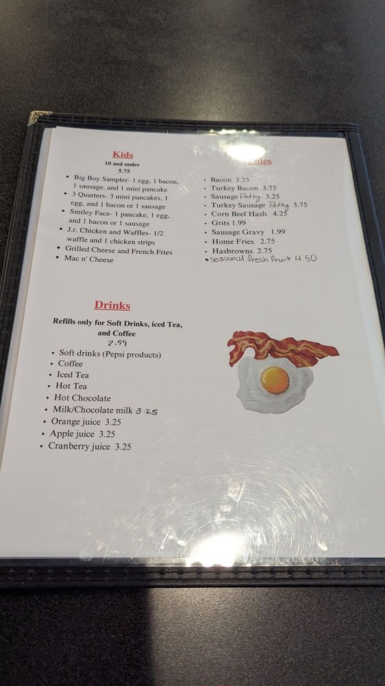 3 mini pancakes, 1 egg* and one bacon or sausage. Eggs and steak. May be cooked to order. Consumer advisory consuming raw or undercooked meats, poultry, or eggs may increase risk of foodborne illness especially if you have certain medical conditions.