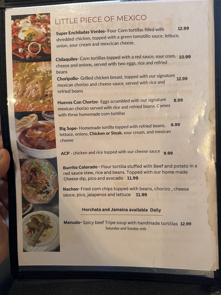 Crispy Corn tortillas bathed in our homemade red sauce topped with cotija cheese, sour cream, red onions and two eggs cooked to your preference. With a side of refried beans and Mexican rice.